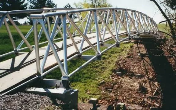 A steel bridge under construction over a grassy area with some dirt and gravel.